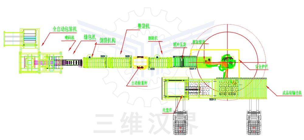 硫銨從烘干床下料口落入輸送帶輸送到包裝機(jī)料倉,自動(dòng)下料、稱重、取袋套袋、裝料、縫包后,整形并輸送給碼垛機(jī)器人,機(jī)器人碼垛、托盤庫自動(dòng)供給空托盤、滿垛輸送機(jī)輸送、托盤全自動(dòng)裝車機(jī)裝車或轉(zhuǎn)運(yùn)到倉庫既定位置整齊擺放。
