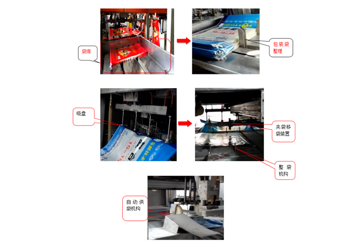 1.將包裝袋放入袋庫,袋庫自動將包裝袋進行整理,一排包裝袋上完以后自動將第二排推出,依次將第三排推出,袋庫中包裝袋不足時系統(tǒng)自動報警,提示添加包裝袋。