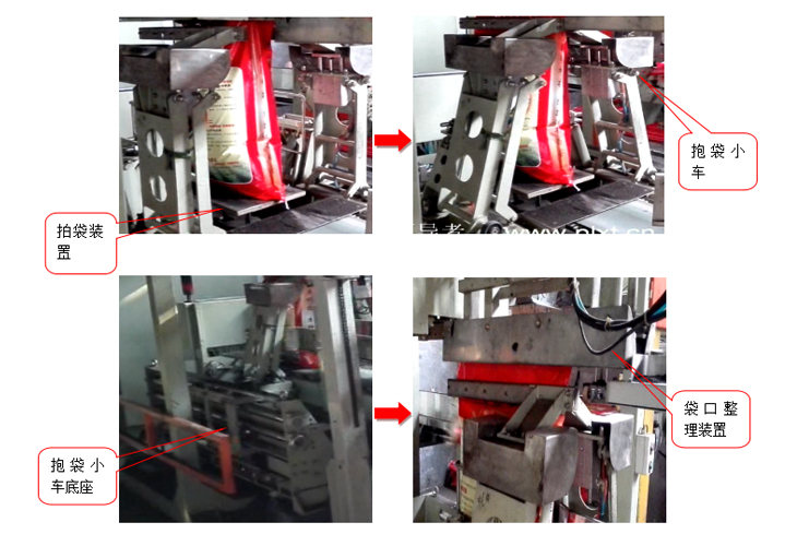 定量包裝機下料灌裝的過程中,底部的拍袋裝置啟動,確保袋內(nèi)物料充填緊密。灌裝結束后拍打停止,下料口夾袋裝置打開,充填物料后的包裝袋在下料口放下的同時,由送包小車經(jīng)專門加工的用于粉體、顆粒物料料袋的抱包、夾包裝置將料袋中部抱住,袋口夾住,送至活動導入裝置,活動導入與熱合縫包一體機系統(tǒng)相連.經(jīng)其進入封口傳動鏈中,保證袋口成一字形。在導入器附近增加吸塵口,通過與除塵系統(tǒng)連接可吸走夾住袋口時飛出的粉塵.