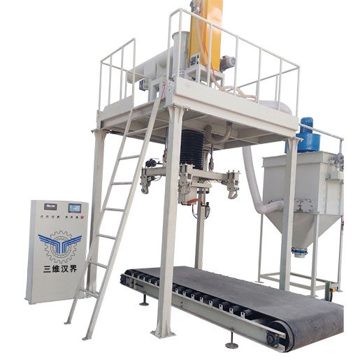 大袋包裝機的稱重方式采用毛重式稱重,不使用稱量斗,物料直接進入包裝袋內。吊耳裝置多為4個,含有內袋的噸包袋則需要加裝吹袋裝置,在物料進入包裝袋前,吹袋裝置先將包裝袋吹開,然后在下料,防止物料在進入包裝袋的過程中形成死角,無法滿載包裝,甚至造成內袋撕裂;除塵機構可使包裝機在包裝粉狀物料保證生產(chǎn)環(huán)境干凈舒適。
